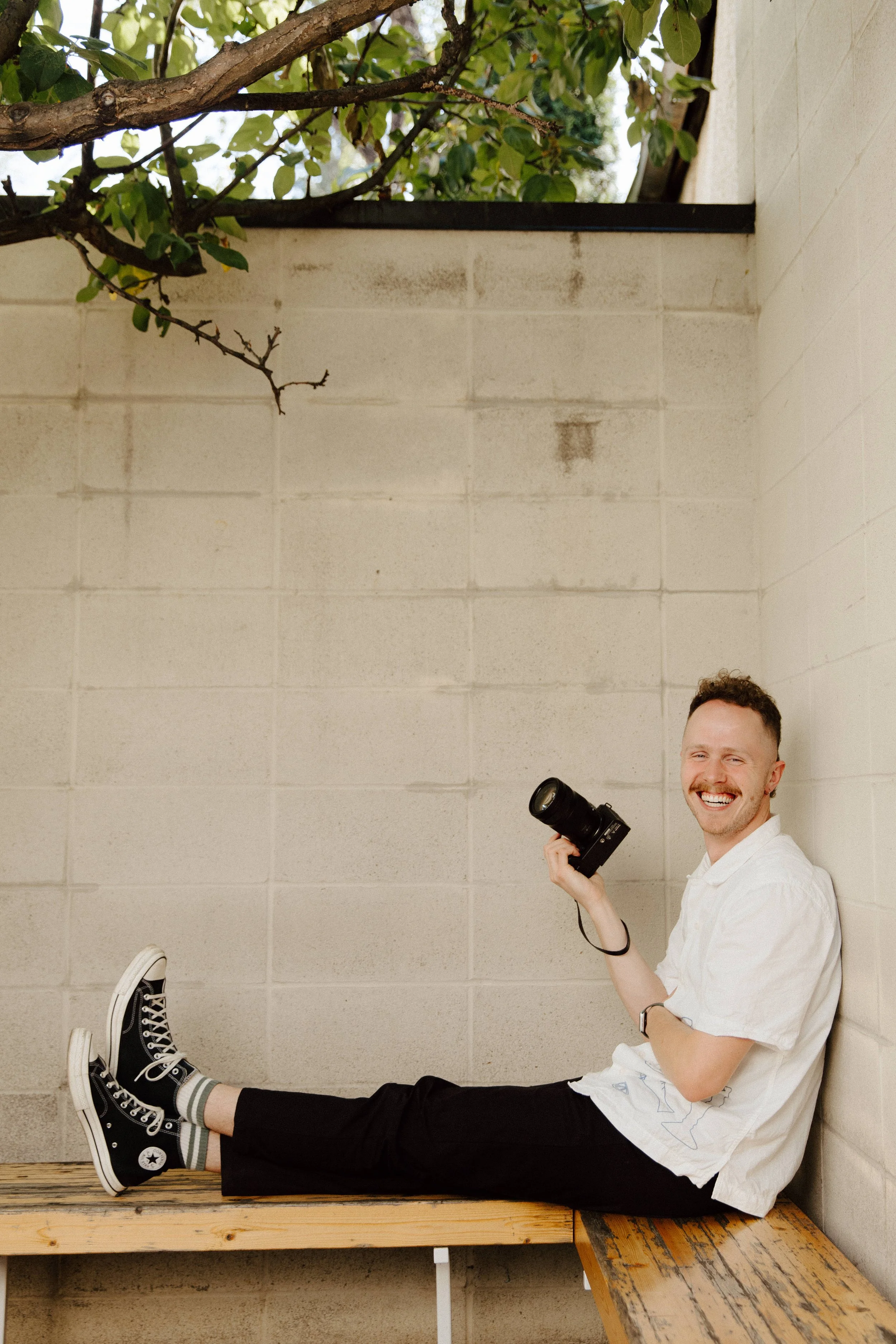 A young man with short curly hair and a mustache, wearing a white shirt, black pants, and black high-top sneakers, sitting on a wooden bench with his legs extended. He is smiling and holding a camera in his right hand, with a beige wall and a tree branch with green leaves behind him.