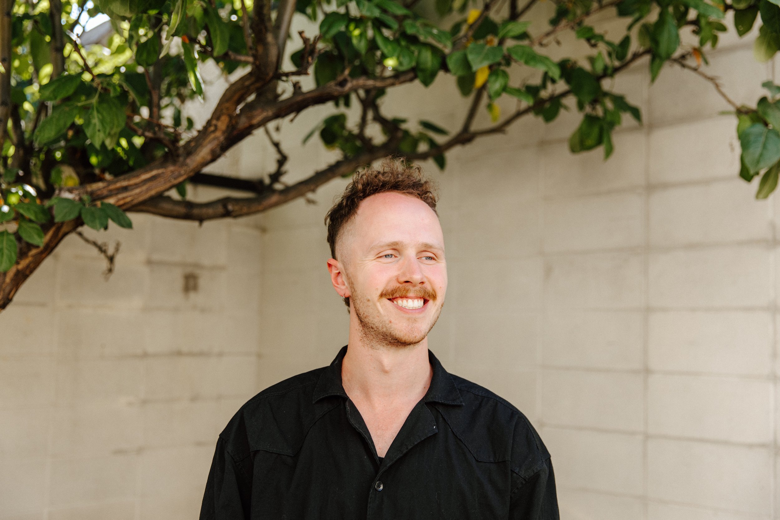 A smiling man with short curly hair and a beard, wearing a black shirt, standing outdoors with greenery and a white wall in the background.